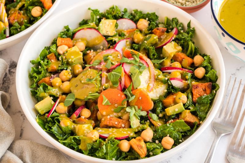 The Plant-Powered Lunch Bowl is a vibrant mix of kale, sweet potatoes, chickpeas, and avocado that fuels your body with cortisol-calming nutrients. From turmeric’s inflammation-fighting properties to hemp seeds and leafy greens rich in magnesium, this bowl brings together the kind of steady energy and nourishment your stress system thrives on.